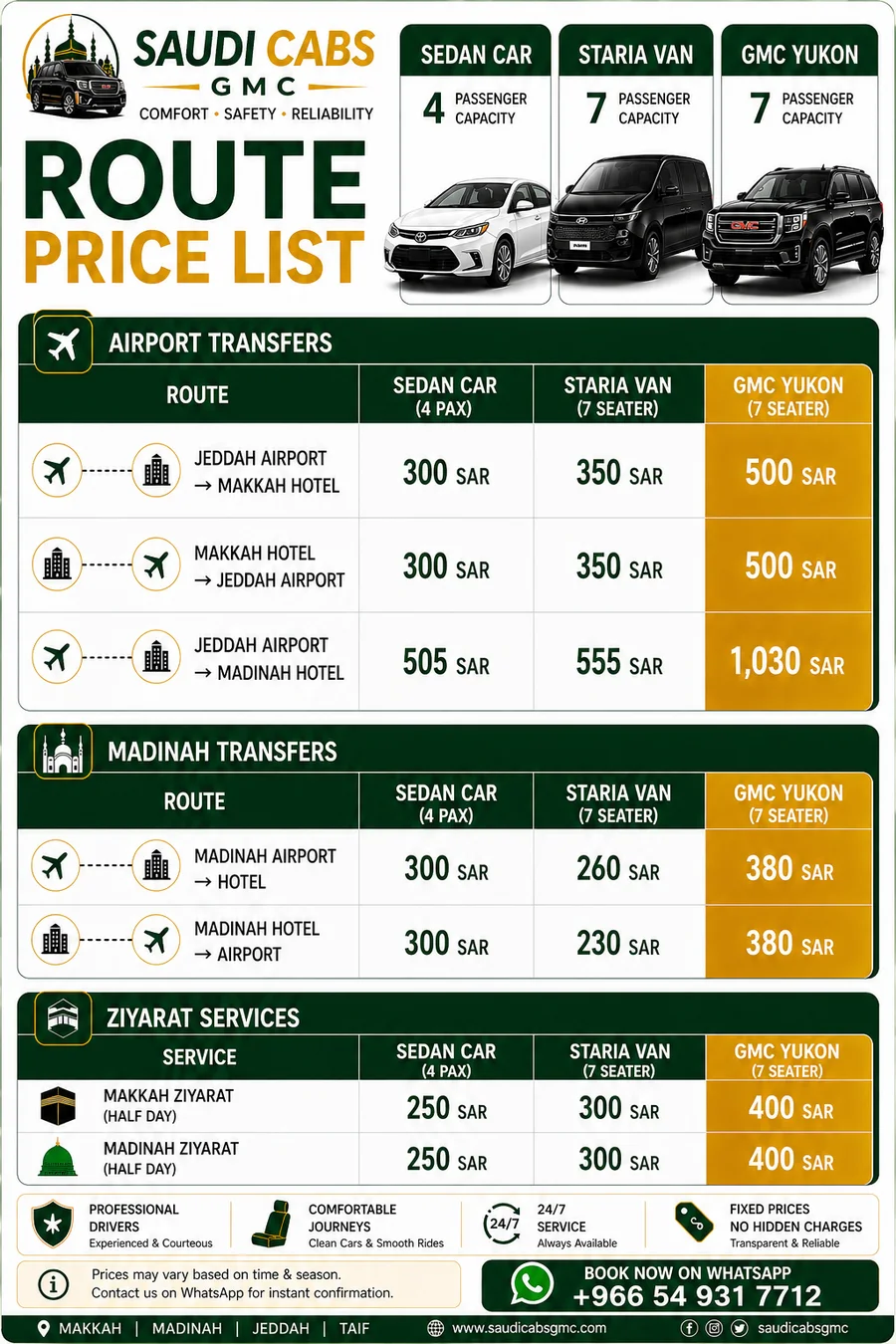 Jeddah Airport • Madinah Airport • Makkah & Madinah Ziyarat — Sedan • Staria • GMC Yukon